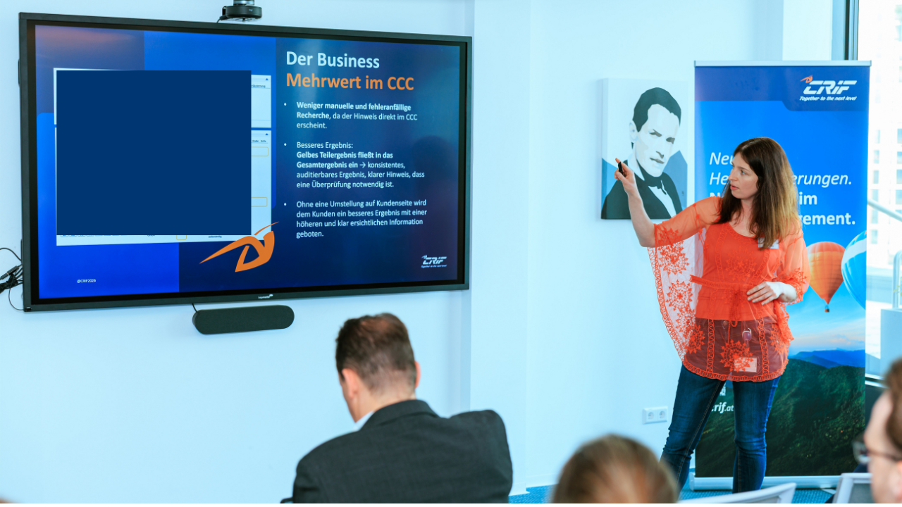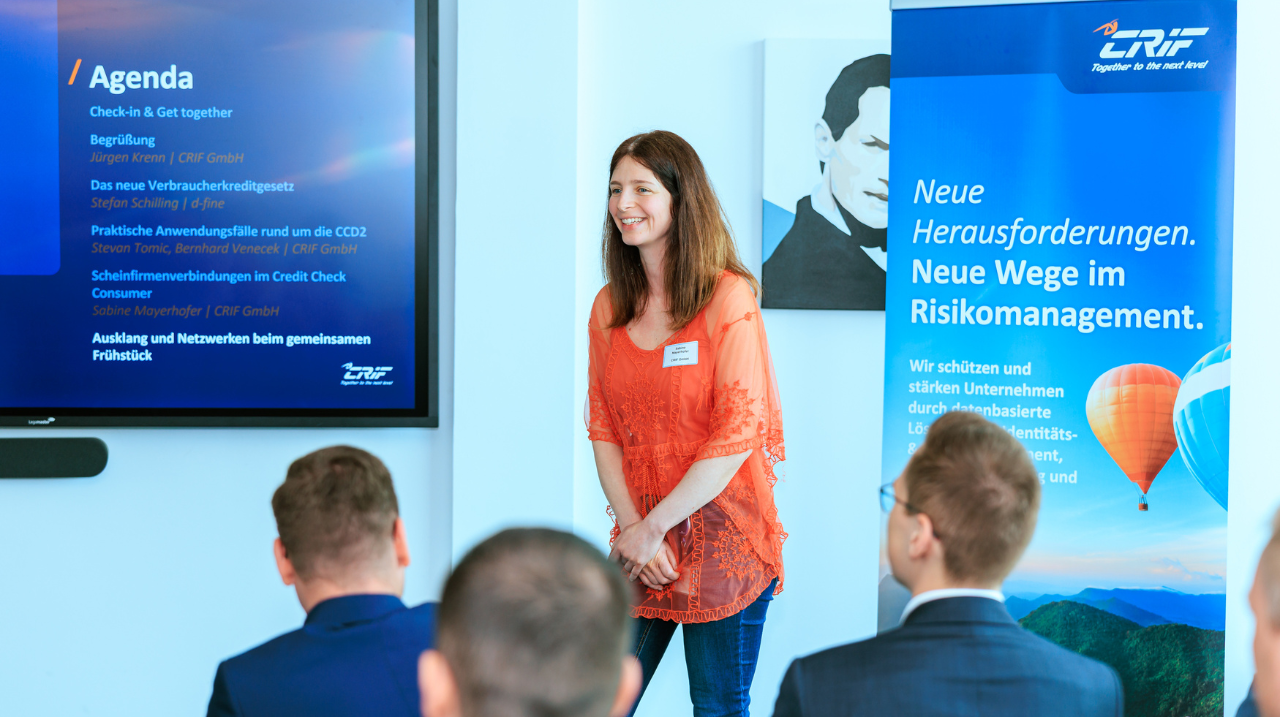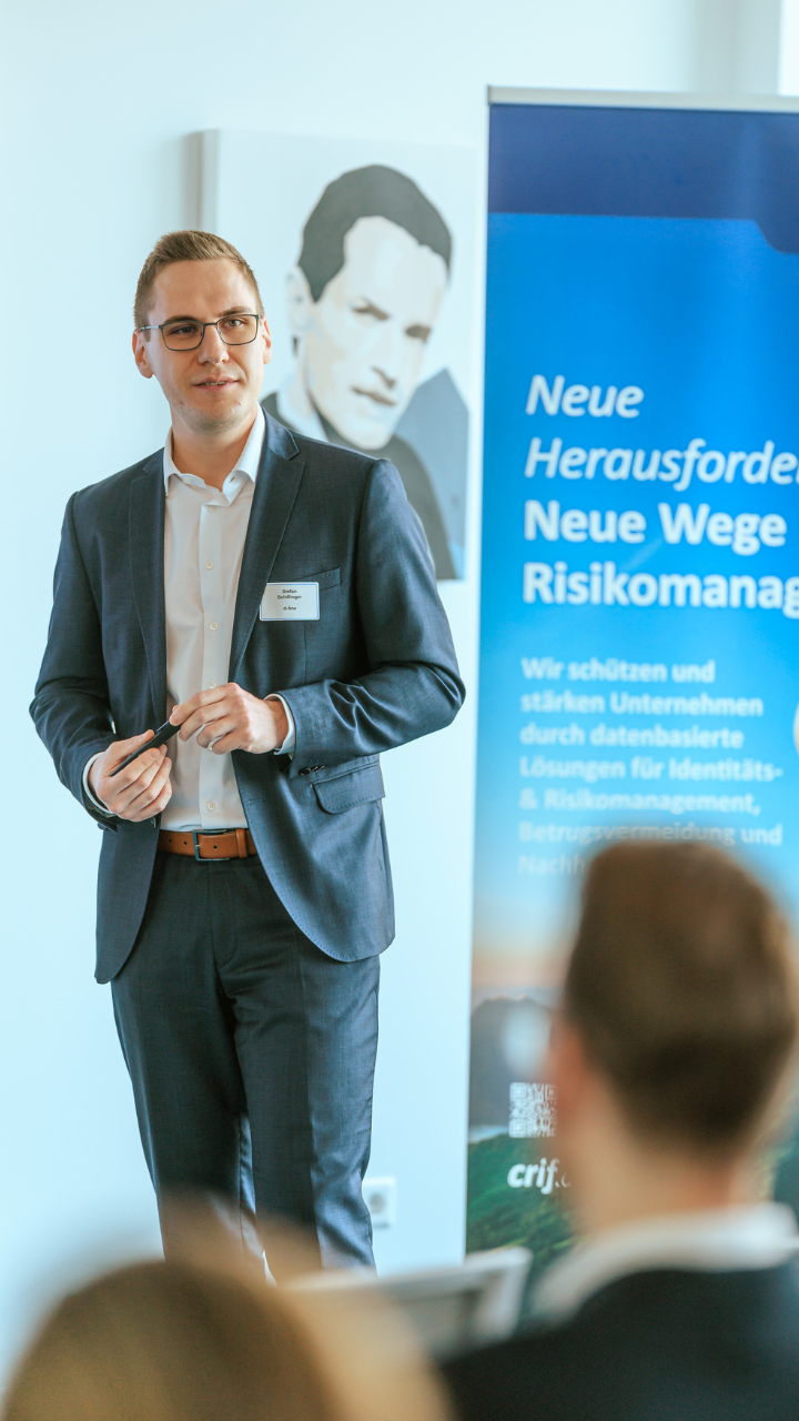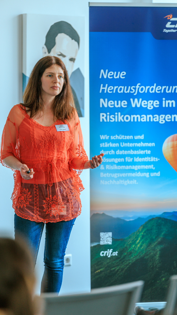 Einen weiteren inhaltlichen Höhepunkt setzte Sabine Mayerhofer (CRIF Österreich) mit ihrem Vortrag zu Scheinfirmenverbindungen im Credit Check Consumer. Sie erläuterte, was unter einer Scheinfirma zu verstehen ist, welche typischen Merkmale bestehen und wie entsprechende Verbindungen im Rahmen der Bonitätsprüfung erkannt werden können. Anhand aktueller Zahlen und Daten wurde deutlich, welchen Mehrwert klare Hinweise auf Scheinfirmenverbindungen für das Risiko‑ und Kreditmanagement darstellen – insbesondere durch reduzierte manuelle Recherche und bessere Entscheidungsqualität.